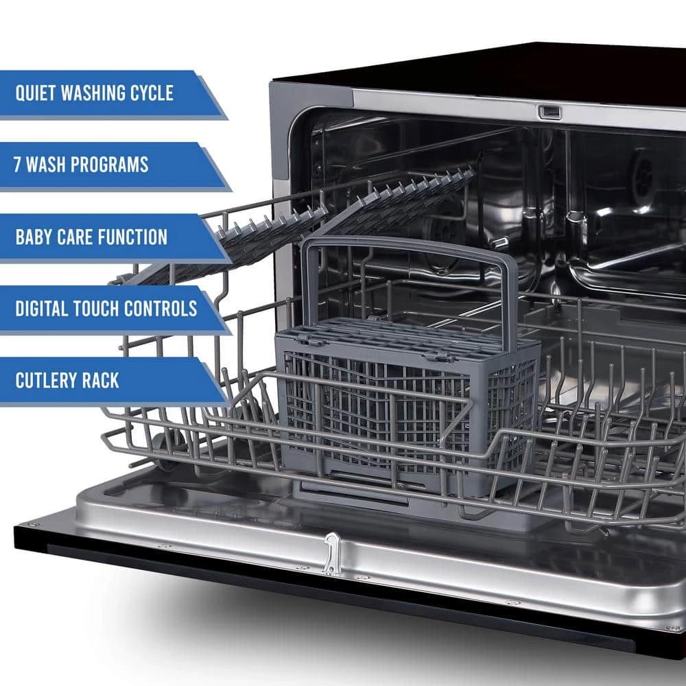 - 7-washing programs: you’ll get full size dishwasher cleaning in a countertop sized compact unit that offers seven wash programs – heavy, normal, baby care, light, glass, speed 45-minutes, self-clean