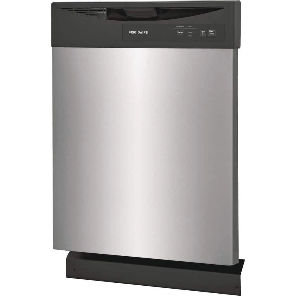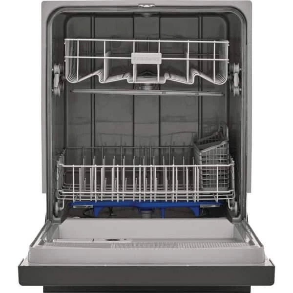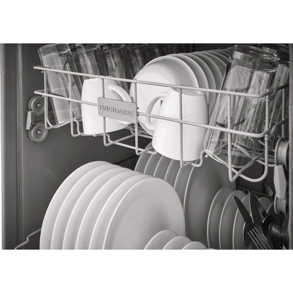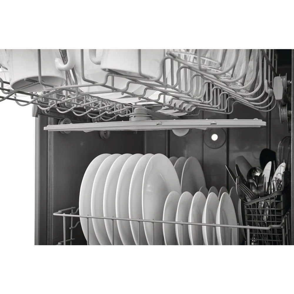 The Frigidaire 24 in. built-in dishwasher offers a complete clean with the 5-level wash system, featuring an upper spray nozzle, middle spray arm, and lower spray arm. Reduce energy use with the no heat dry option. Clean 14-place settings in one cycle.