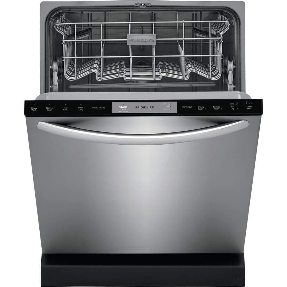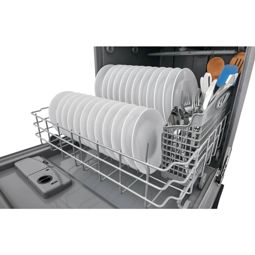 The sleek Frigidaire 24 in. built-in dishwasher with integrated controls uses the exclusive OrbitClean Spray Arm technology, providing 4 times better water coverage. The Heated Dry system ensures that there’s no need to towel dry before putting the dishes away. With its large capacity and ability to control water pressure based on our dishware, this dishwasher will guarantee a wash that best fits your needs.