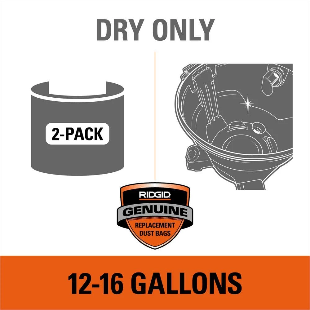 - Includes 2 RIDGID High-Efficiency Size A Dust Collection Bags for RIDGID wet/dry shop vacuums to help handle large messes easily and dispose of it quickly โ dry pickup only