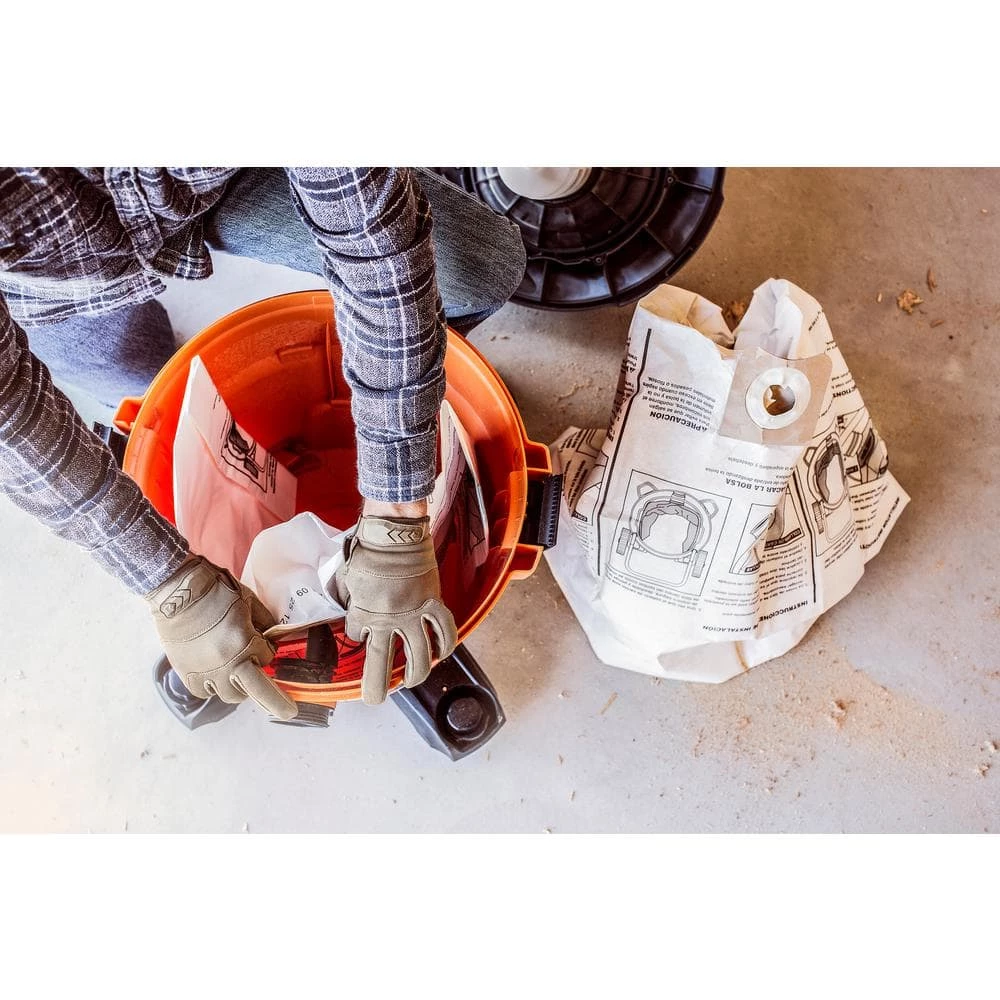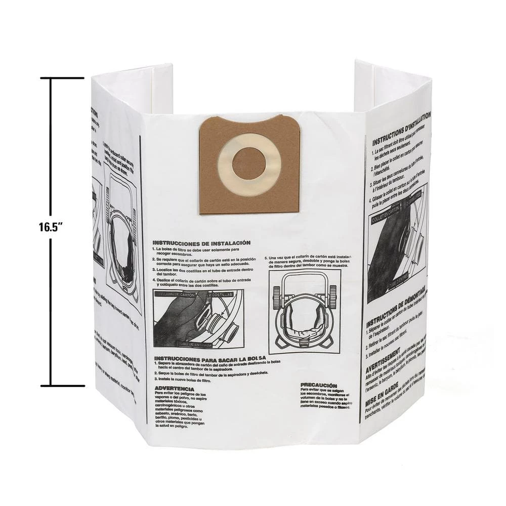Keep the mess contained with the RIDGID (size A) wet/dry vacuum dust bag. With this 2-pack, you can always be prepared for large project cleanups so that easy disposal is right at your fingertips. The shop vac filter bag fits most 12 – 16 Gal. RIDGID wet/dry vacs and helps clean up small, dry debris such as drywall dust. The addition of the dust bag allows for a no-mess drum while cleaning. Simply remove the bag from the vacuum and toss for a quick cleanup – no drum lifting needed. These high-efficiency filter bags can help vacuum performance and provide a cleaner operation because it minimizes debris clogs in the filter to increase the filter life. When you pair dust bags with a RIDGID filter (sold separately), you can help optimize your vacuum performance for an efficient project cleanup experience. Also, a range of value pack sizes (6-count, 12-count, 24-count and 36-count) are available to accommodate a variety of project needs. Installation and removal is simple – align collar of dust bag with inlet, press collar against the shop vacuum drum and remove by popping the collar out from the inlet.