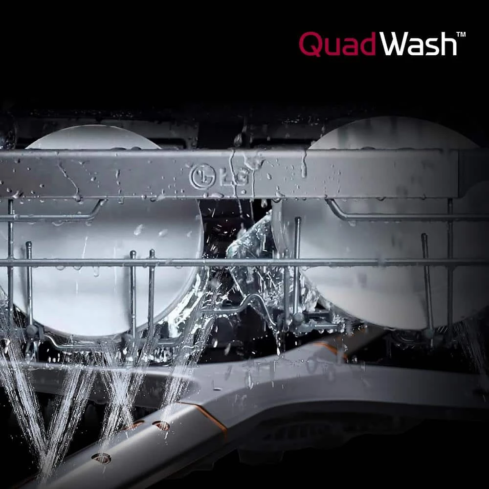 - With four spray arms instead of just two, quadwash uses multi-motion arms that rotate back and forth while spinning to power-clean dishes from multiple angles throughout the entire cycle