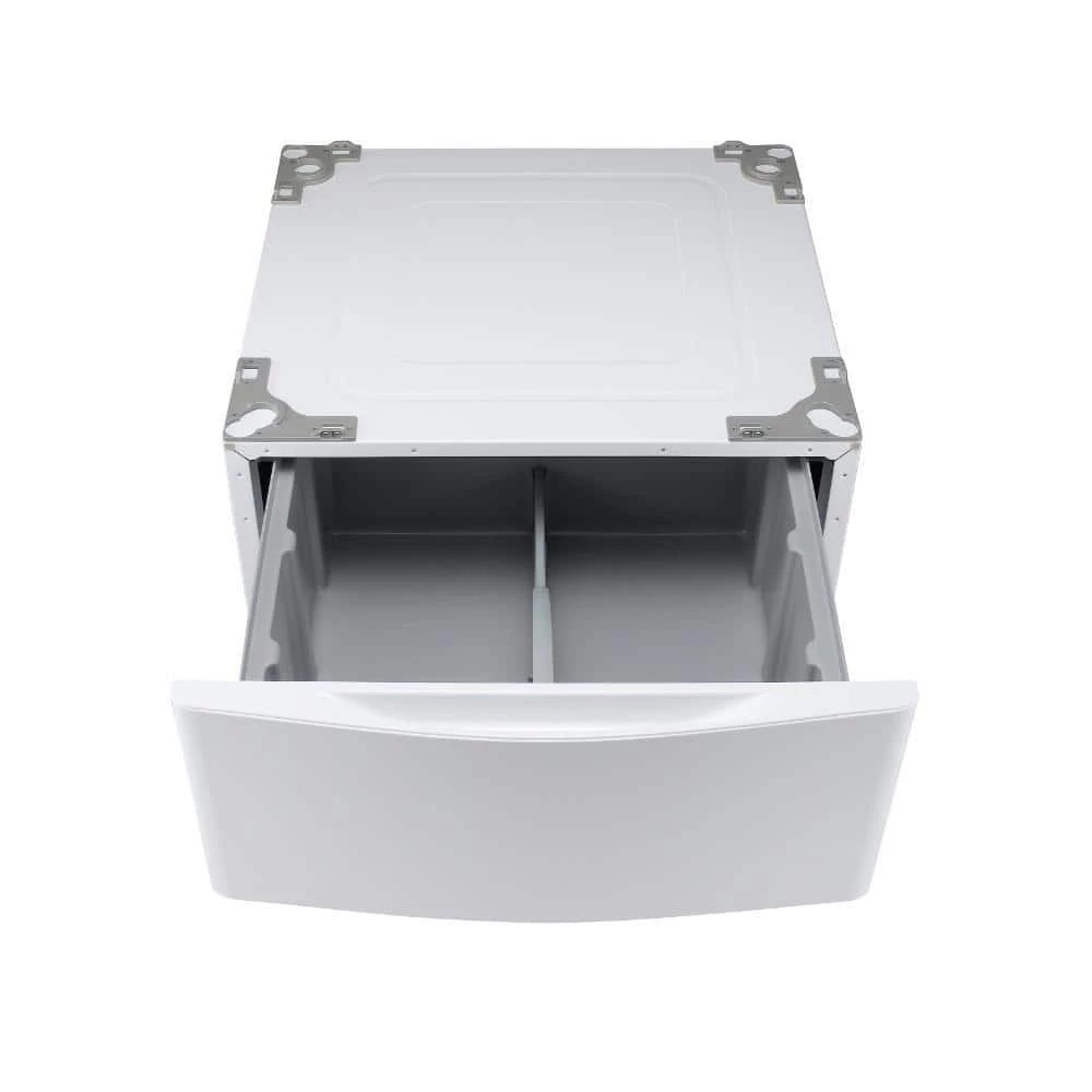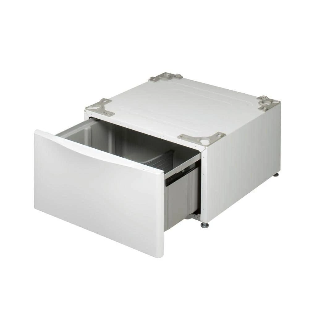- Convenient drawer stores laundry supplies and elevates the washer or dryer for easier loading and unloading