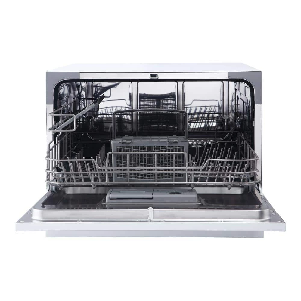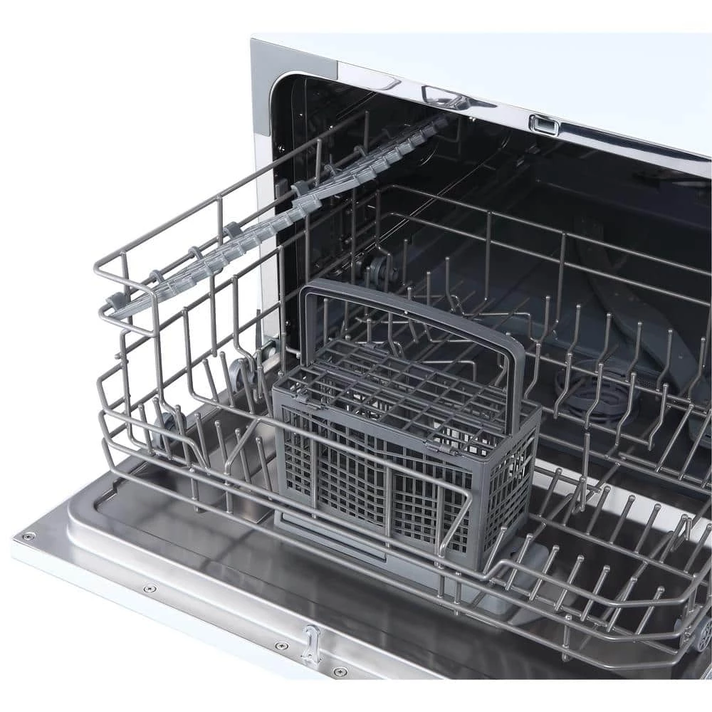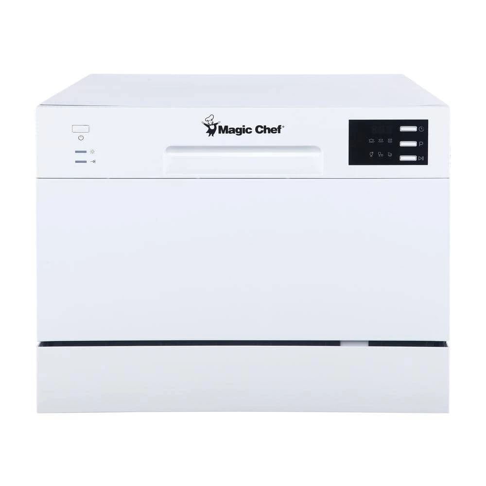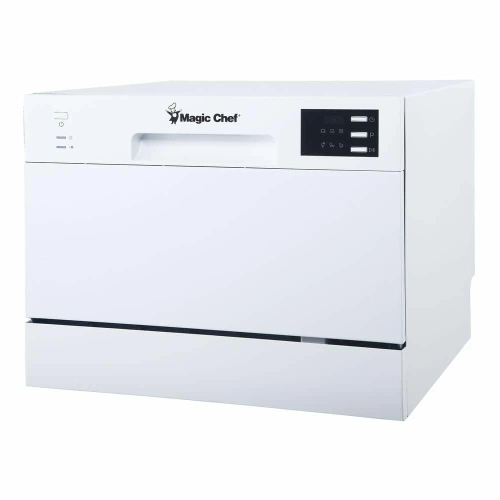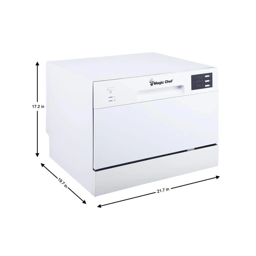 The Magic Chef Countertop Portable Dishwasher provides all the convenience of a full-size dishwasher for cleaning your dishes. It features enough space to accommodate 6-standard place settings, making it perfect for singles, couples, apartments or the office kitchen. With easy-to-use, push-button electronic controls, it is designed with a stainless steel interior that includes a durable rack, silverware basket and cup shelf for easy loading.