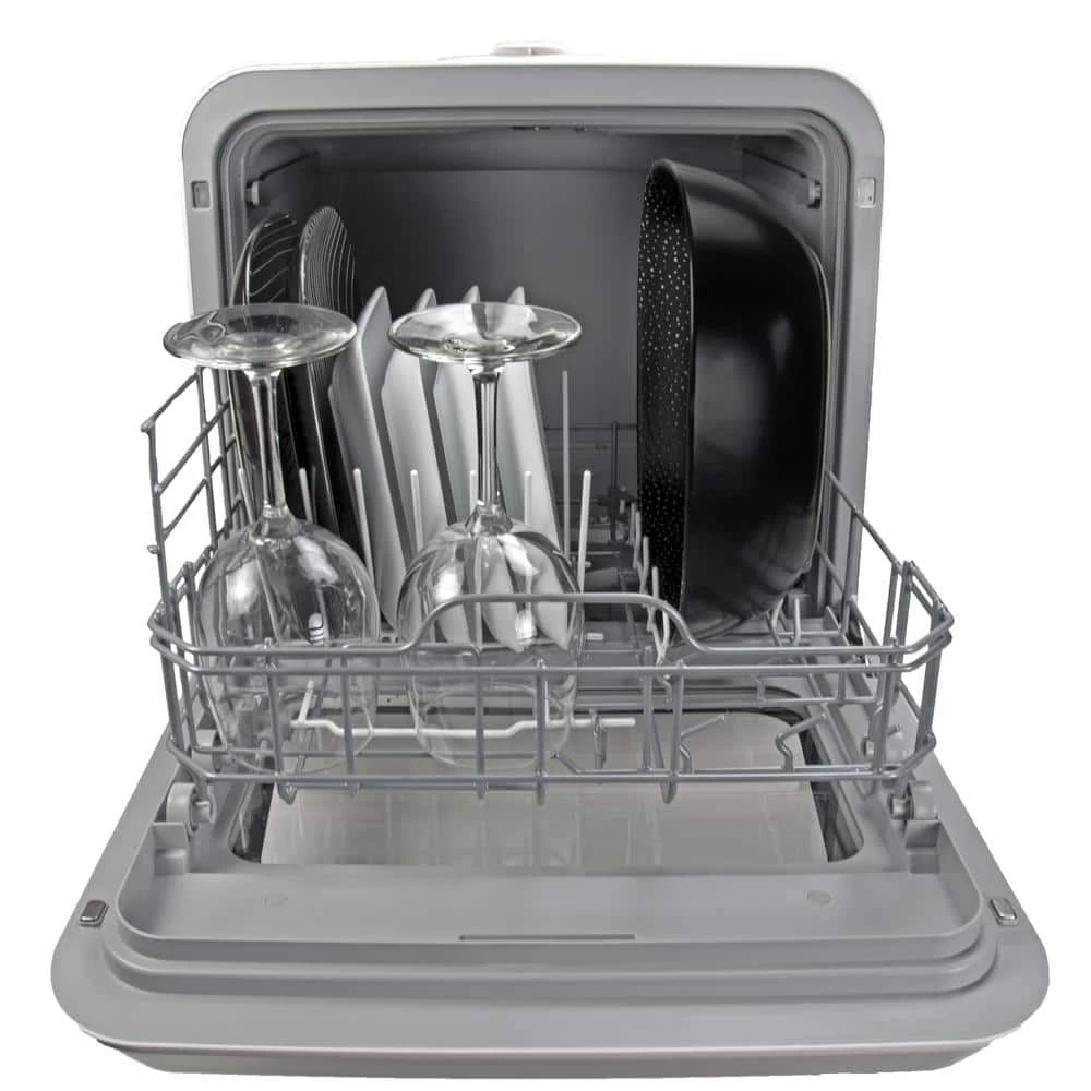- Up to 2-3 complete place settings can comfortably fit in the compact dishwasher by removing the top rack and loading flatware in basket in main rack