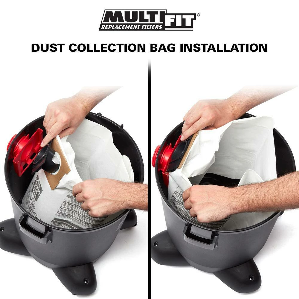 Have MULTI FIT Dust Collection Bags on hand whenever the job calls for it with this 36-count value pack – buy more and save more. Always be ready for any cleanup mess with this 36-pack of MULTI FIT Replacement Dust Bags designed to fit most Shop-Vac wet dry vacs between 10 – 14 Gal. These high quality collection bags are easy to use and are made for dry pickup such as drywall dust, sawdust and general debris. Remove replacement bags for wet pickup. Using these MULTI FIT shop vac filter bags increases the optimal vacuum performance and prolongs the life of the vac by protecting the motor from harmful dust and debris. While dust bags can provide extra filtration and debris containment, they also offer a convenient option for debris removal. Simply remove bag from drum and dispose. Installation and removal is simple so the job can get done quickly and efficiently. To install, slide the MULTI FIT replacement dust collection bag onto the drum inlet to secure in place – no tools required. General household pickups just got easier. Also, a range of value pack sizes (6-count, 12-count and 24-count) are available to accommodate a variety of project needs.