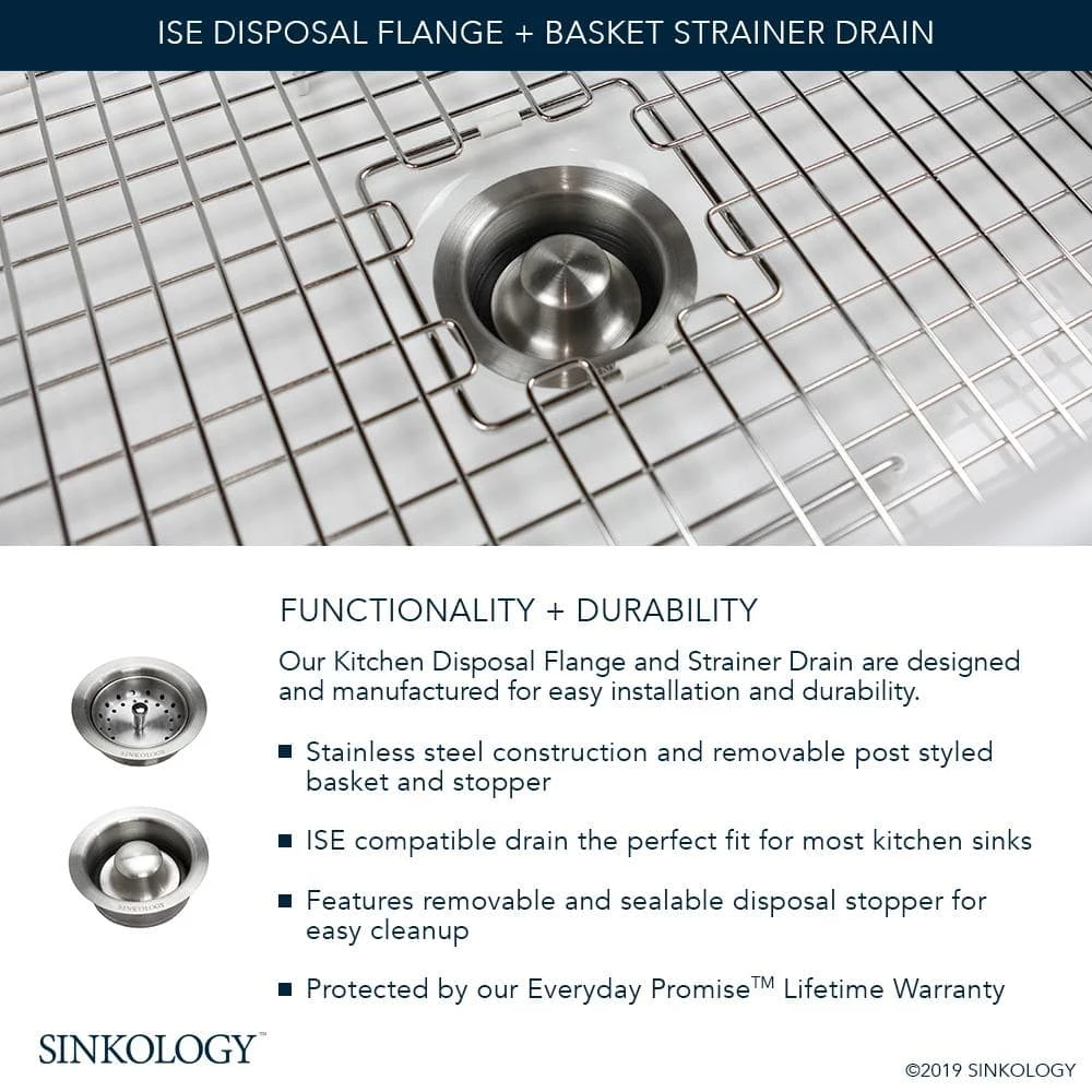 The SINKOLOGY 3.5 in. Kitchen Disposal Flange is designed and manufactured for easy installation and durability. The stainless steel construction and removable stopper makes this ISE compatible drain the perfect fit for most kitchen sinks. The new and improved design improves performance while looking beautiful. Features removable and sealable disposal stopper for easy cleanup and protected by our Everyday Promise Lifetime Warranty.